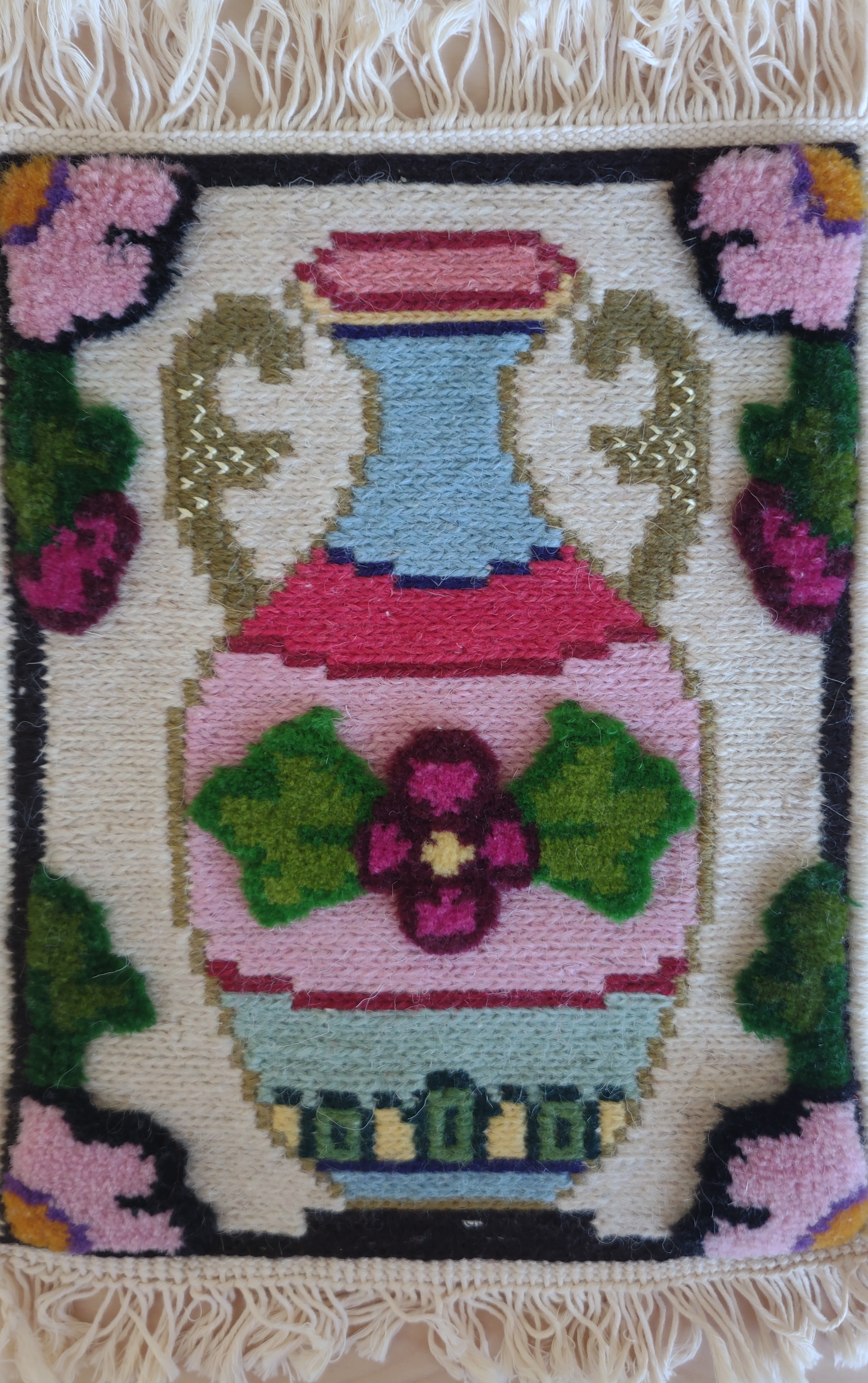Bold geometric kilim weaving with rhythmic color blocks.